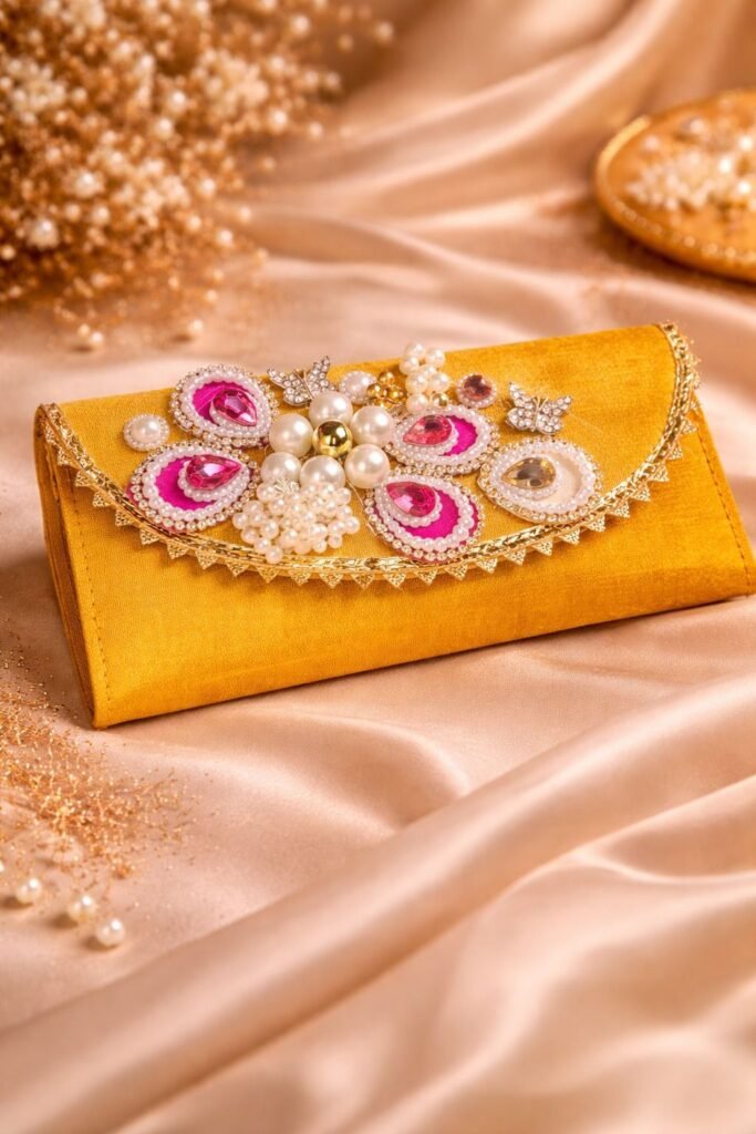 Elegant Handcrafted Mustard Yellow Money Gift Envelope with Pearl & Stone Work