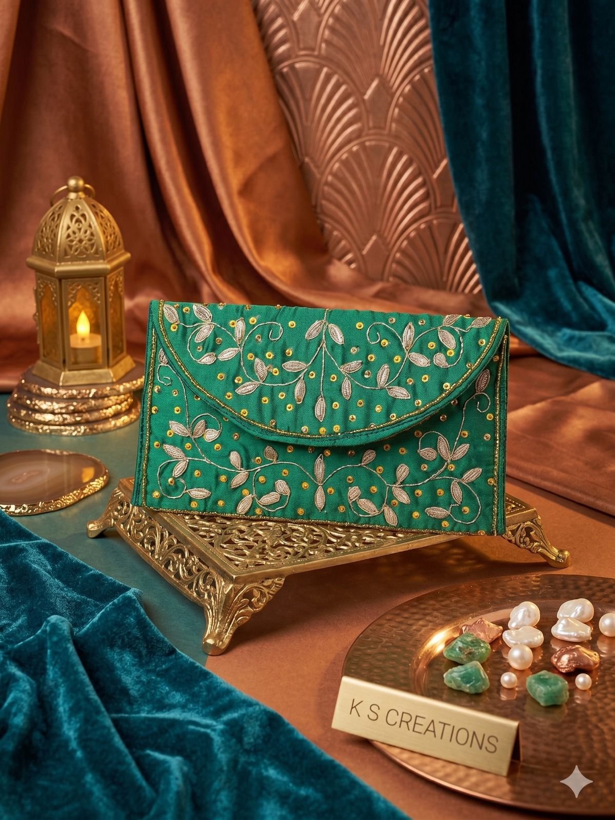 Elegant Handcrafted Green Money Gift Envelope with Gold Embroidery