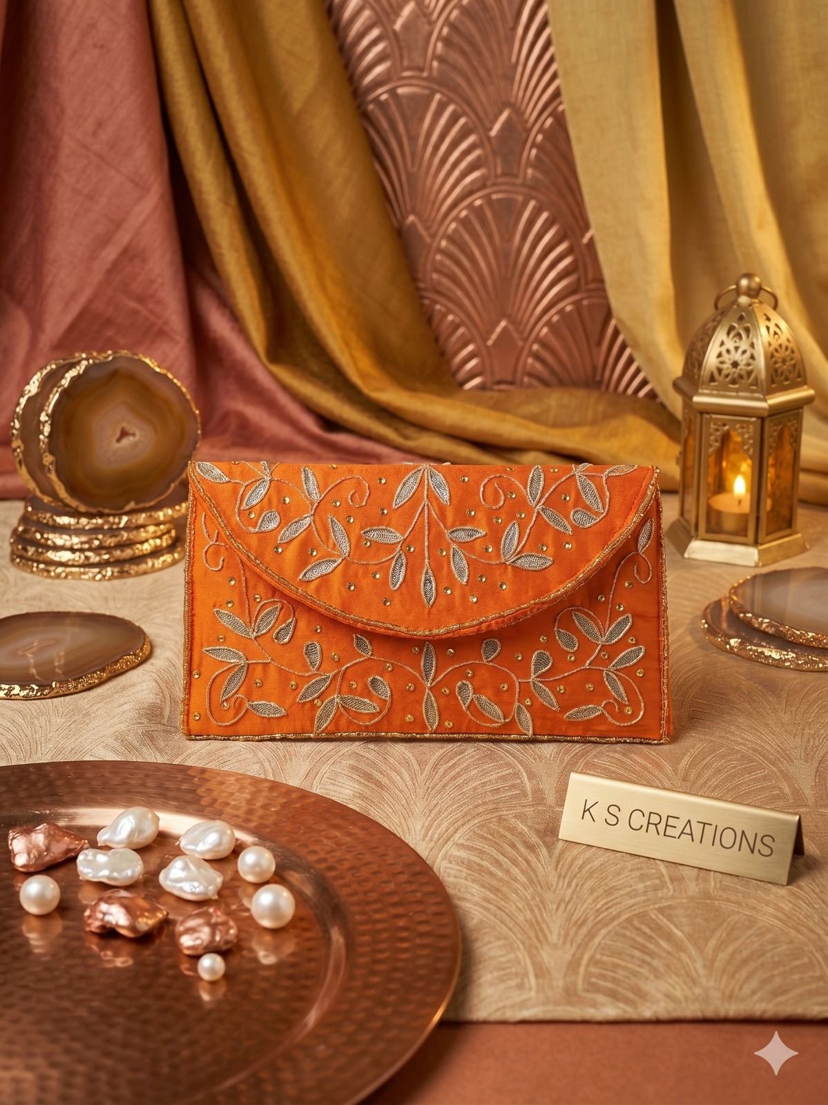 Add a warm and traditional touch to your gifting with this beautifully handcrafted money greeting envelope in a rich orange hue. Featuring intricate leaf-pattern embroidery with subtle golden bead accents, this envelope showcases timeless craftsmanship and understated elegance. The detailed stitching and refined finish make it a perfect blend of simplicity and sophistication.