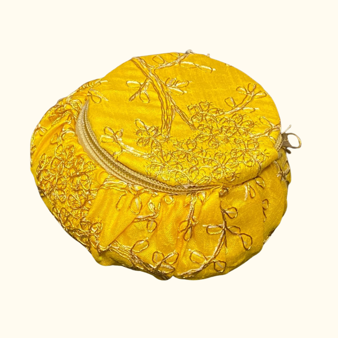 Add a touch of elegance to your special moments with this beautifully handcrafted golden potli box by KS Creations. Designed with rich fabric embroidery, a smooth zipper closure, and delicate floral detailing, this potli box is perfect for holding rings, jewelry, or small wedding essentials. Ideal for engagements, haldi ceremonies, return gifts, or festive gifting.