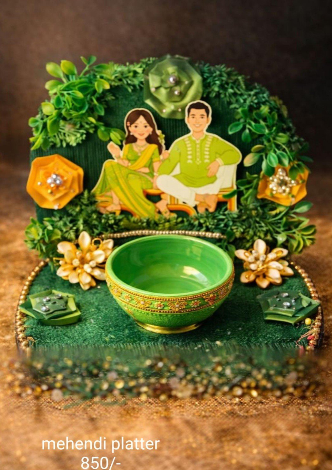 Celebrate the color of love and tradition with this beautifully themed Mehendi Platter from KS Creations. Specially crafted to bring a festive charm to your Henna ceremony, this platter combines traditional aesthetics with a modern, playful touch.