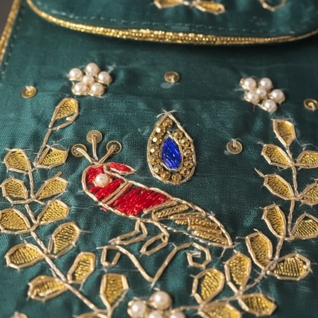 Handcrafted Peacock Embroidered Potli Bag with Pearl Handle