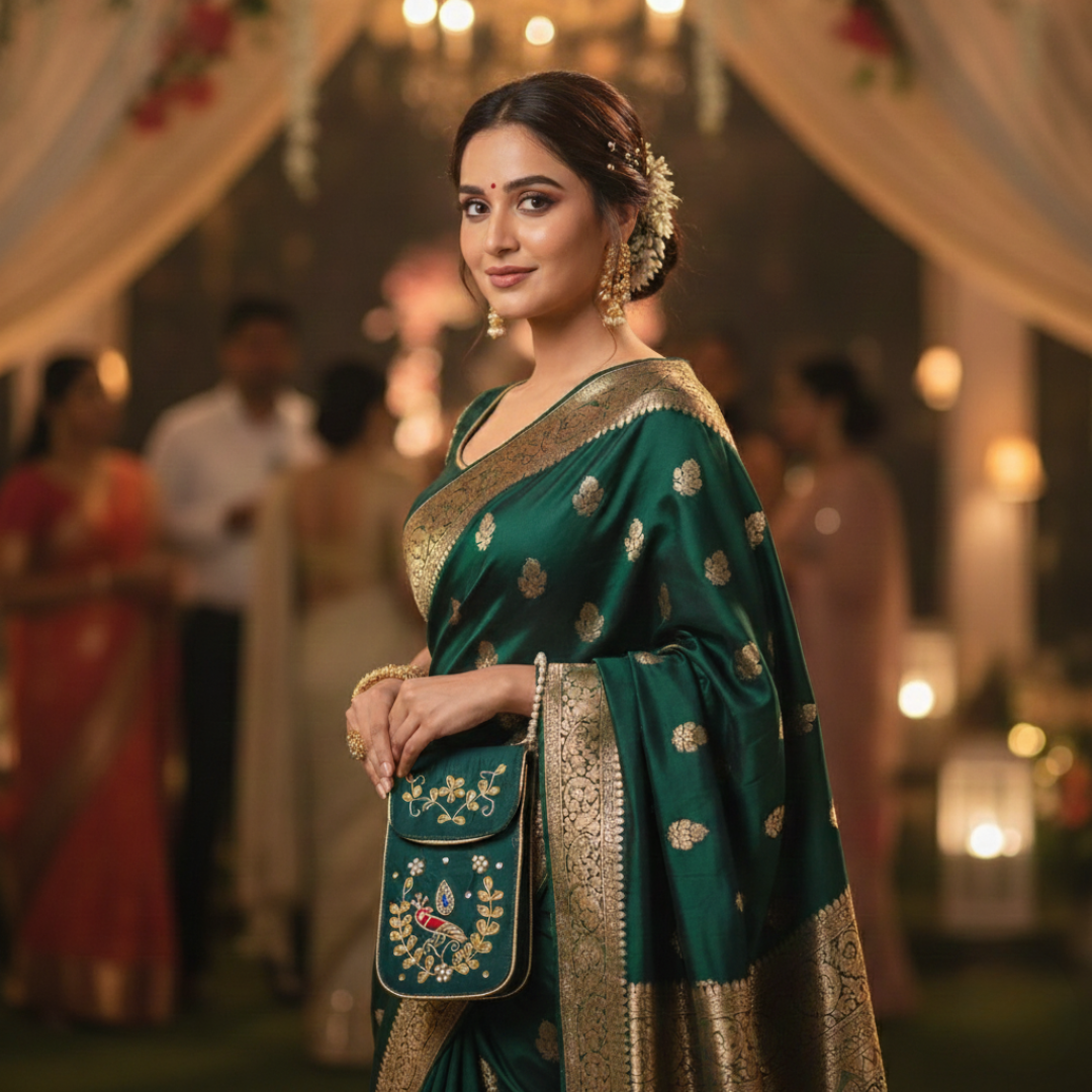 Add a touch of elegance and tradition to your gifting with this beautifully handcrafted potli bag by KS Creations. Designed on rich deep-green fabric, this potli features intricate peacock embroidery, delicate floral motifs, fine golden thread work, and subtle bead detailing that reflects timeless Indian craftsmanship.
