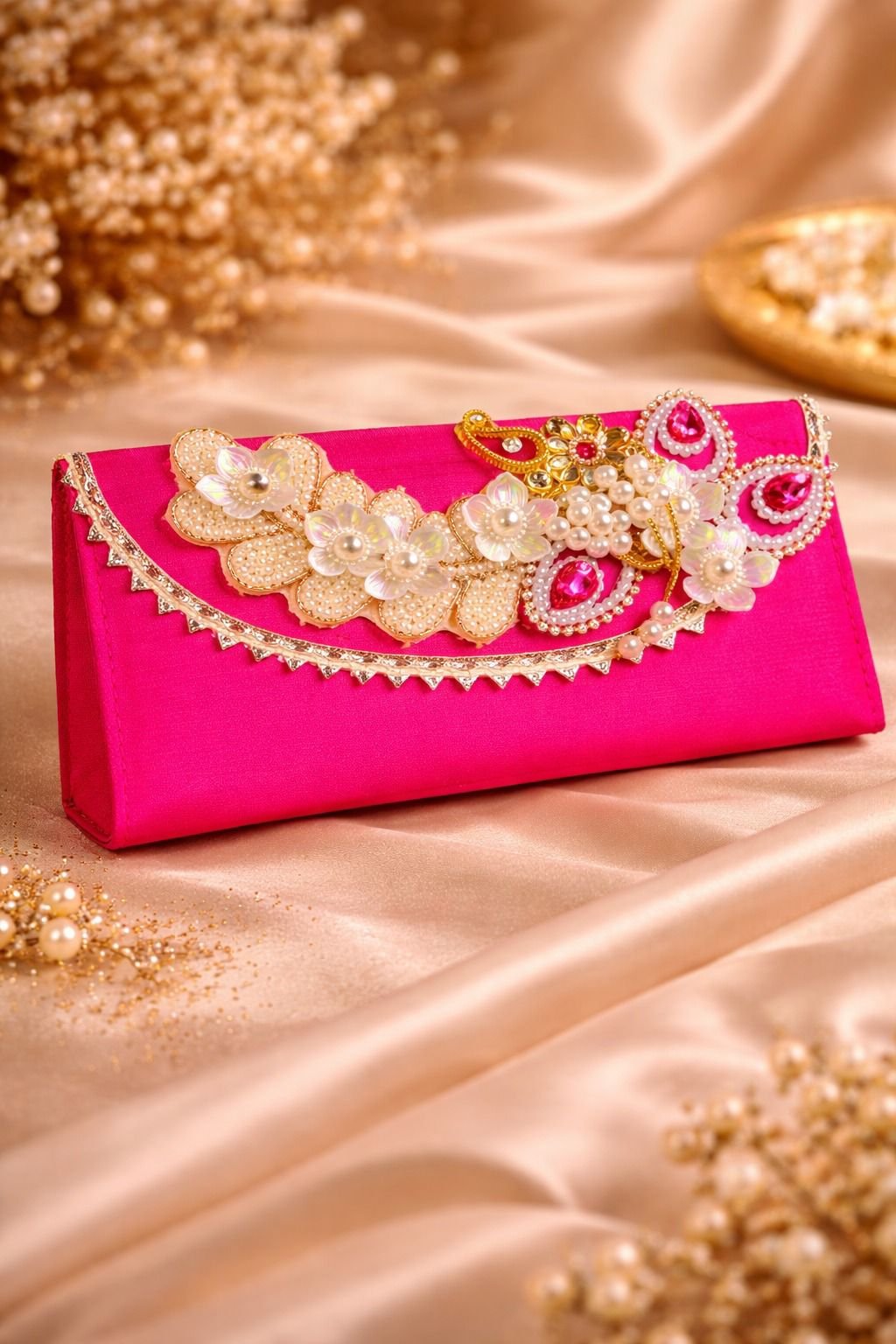 Make your gifting truly stand out with this vibrant and luxurious money greeting envelope in a striking pink shade. Beautifully handcrafted, it features intricate floral embellishments, delicate pearl work, and eye-catching stone accents that add a rich and festive appeal. The fine gold detailing along the flap enhances its elegance, making it a perfect blend of tradition and modern style.