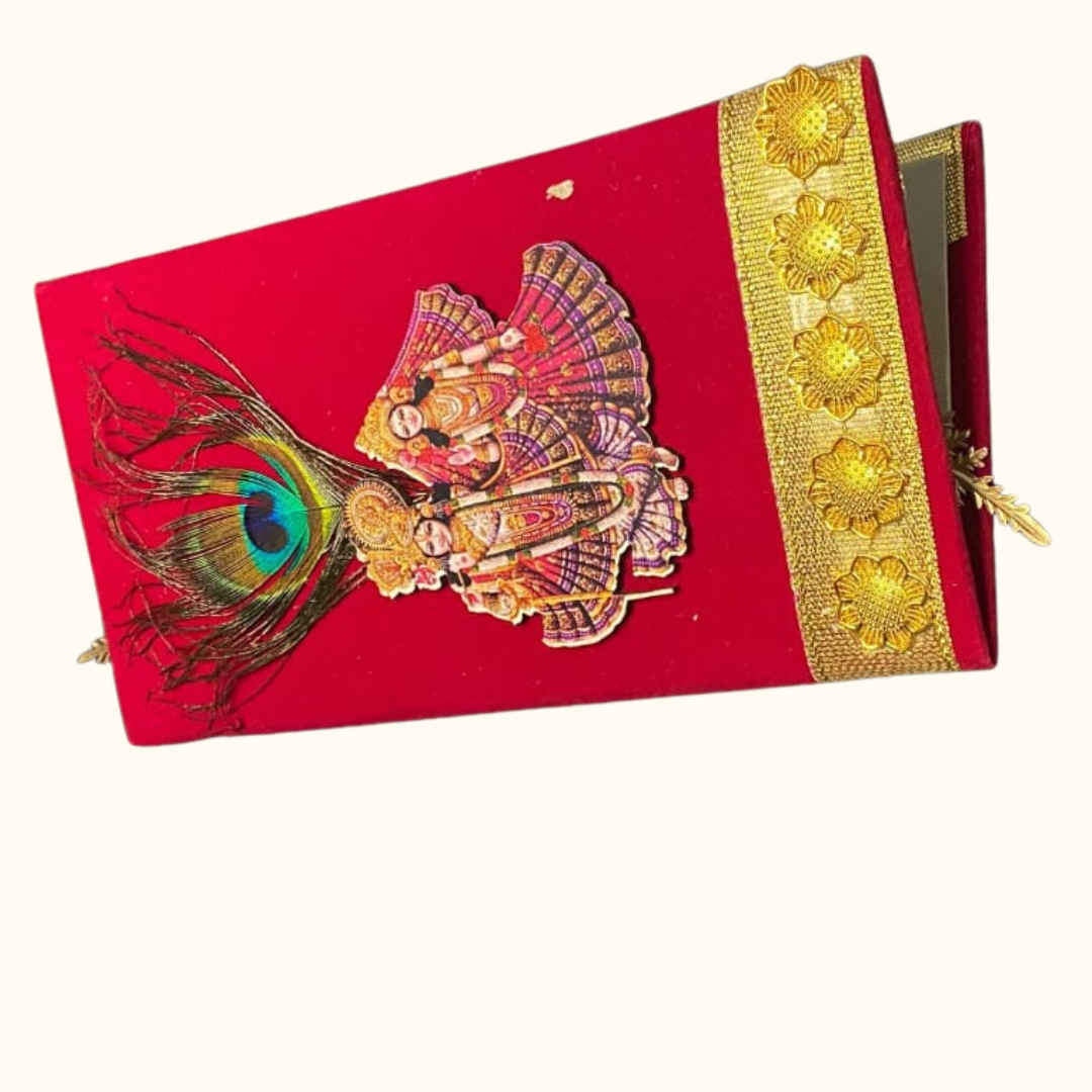 The KSCREATIONS Radha Krishna Velvet Gift Envelope is a beautiful blend of devotion and luxury. Made with rich red velvet fabric, this envelope is decorated with an elegant Radha-Krishna design and a sacred peacock feather, symbolizing love, blessings, and prosperity.